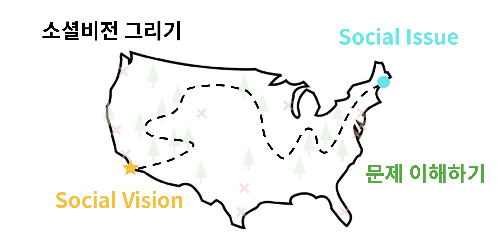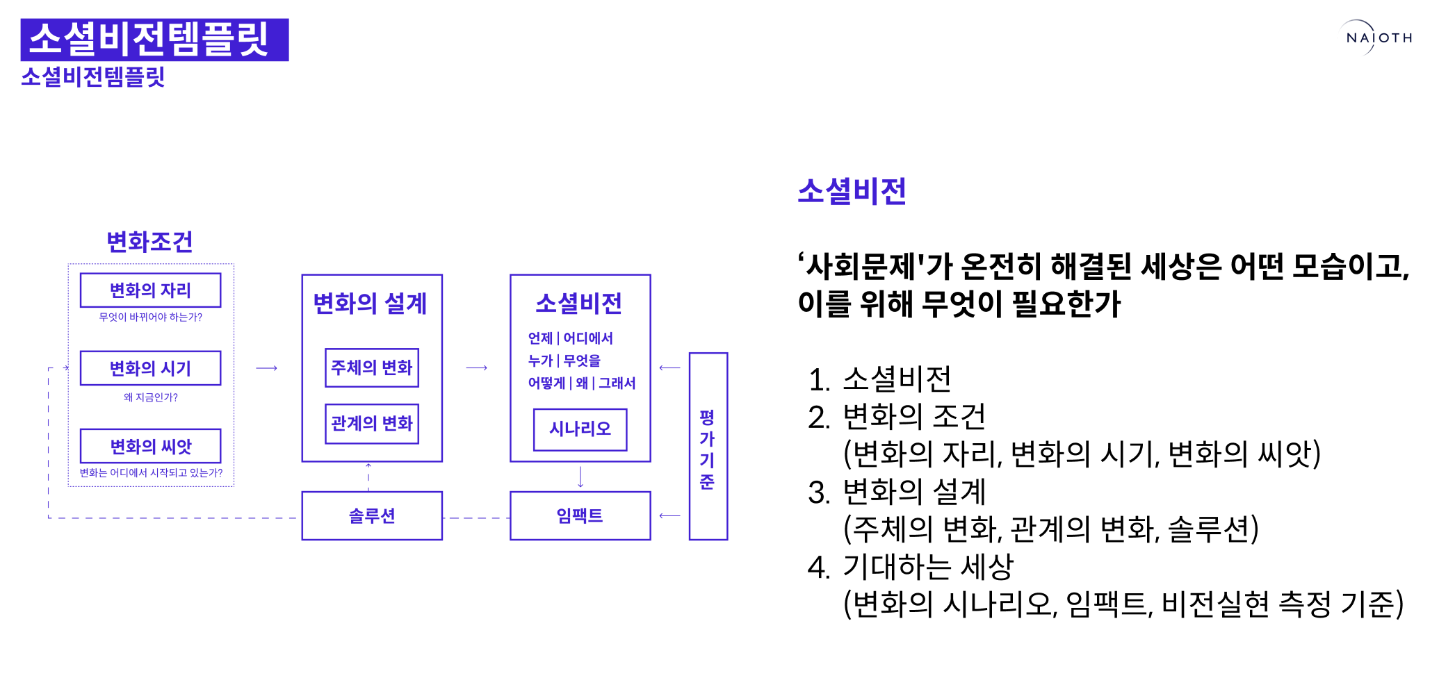2주차에서 공개한 나이오트의 문제분석이 3주차에서 어떻게 소셜비전으로 전환되는지를 예시로 보여줍니다.
