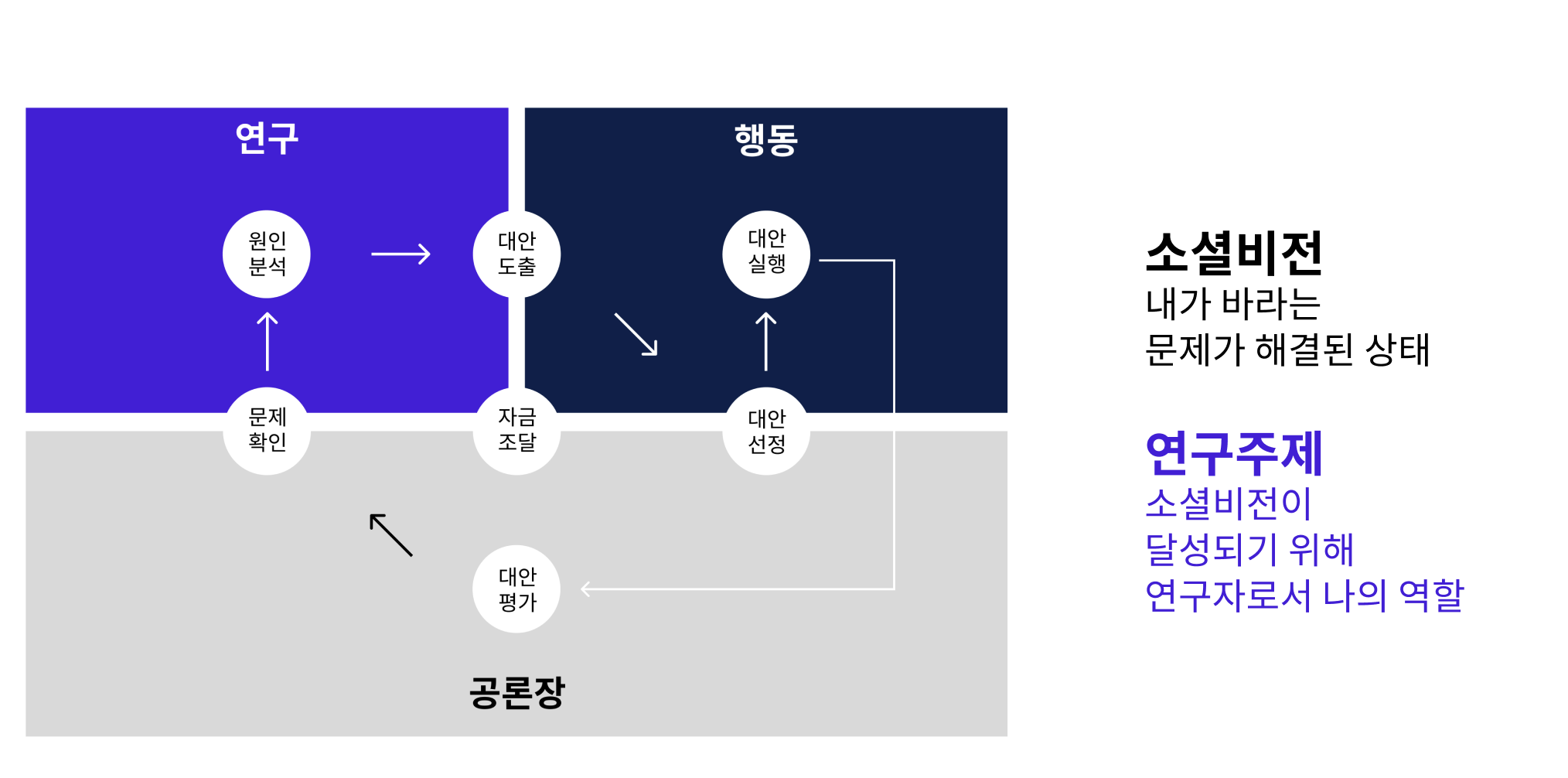 이 두 고리에서 소셜비전이 시작됩니다. "진심을 가진 누구나 플랫폼 OS를 활용해 연구하고, 사회문제를 실시간으로 해결하는 솔루션을 제안할 수 있는 세상." 문제분석에서 드러난 세 층위(연구-지식-문제해결)의 단절이, 비전에서는 플랫폼으로 연결된 생태계로 뒤집힙니다.