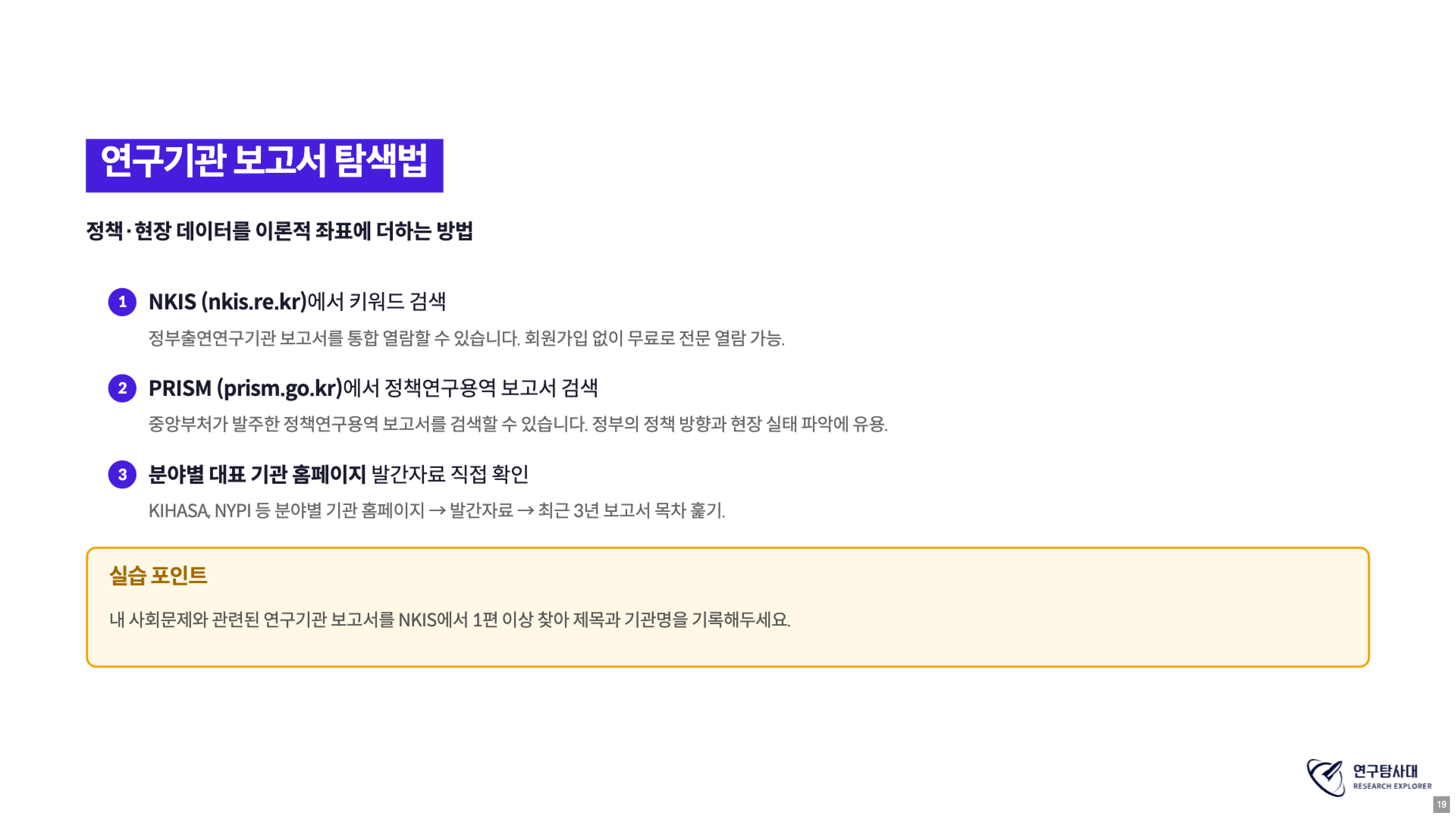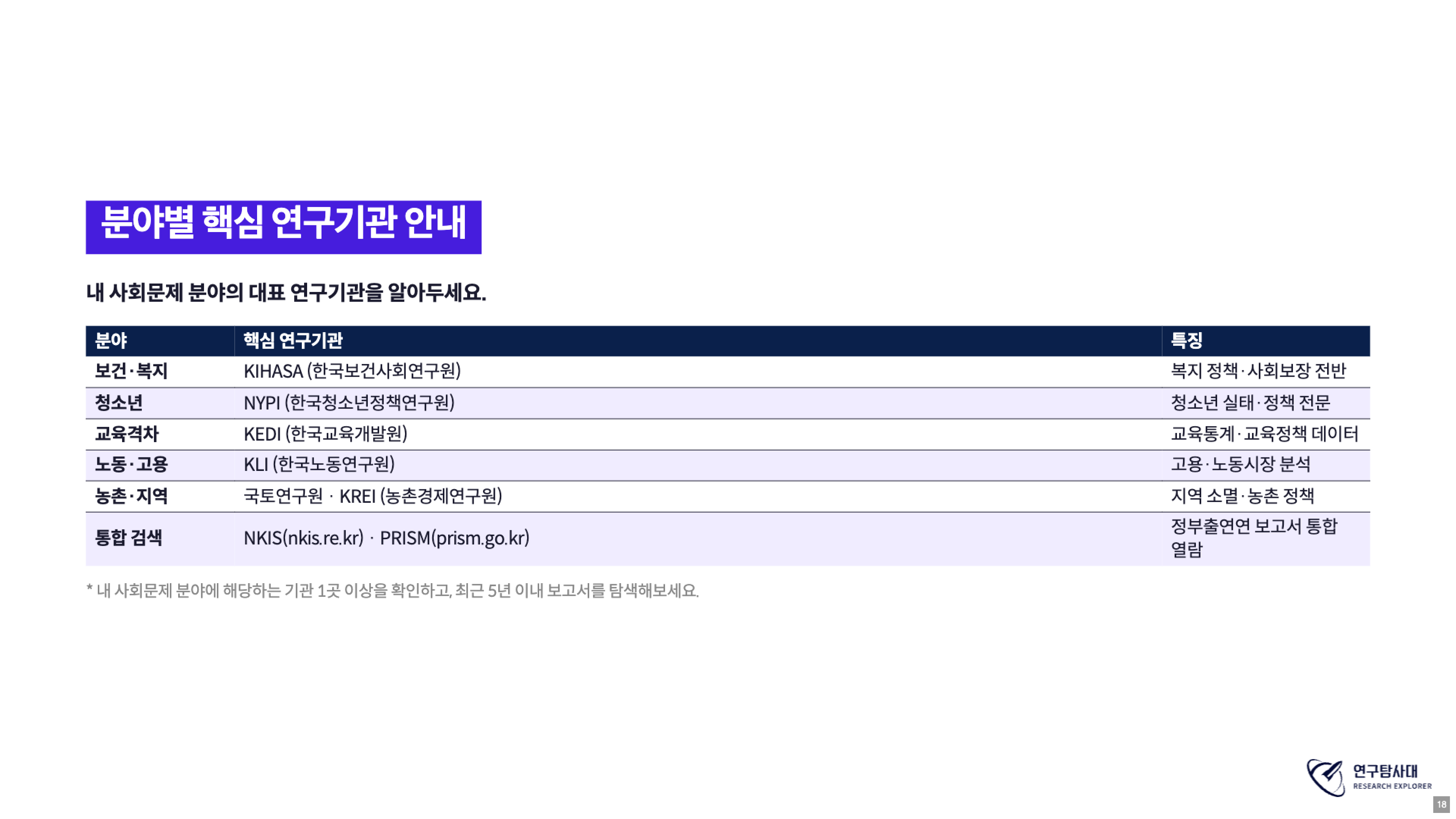 분야별 핵심 연구기관도 함께 안내되었다. 보건·복지 분야는 KIHASA(한국보건사회연구원), 청소년은 NYPI(한국청소년정책연구원), 교육격차는 KEDI(한국교육개발원) 등이다. 통합 검색은 NKIS(nkis.re.kr)와 PRISM(prism.go.kr)을 활용한다.