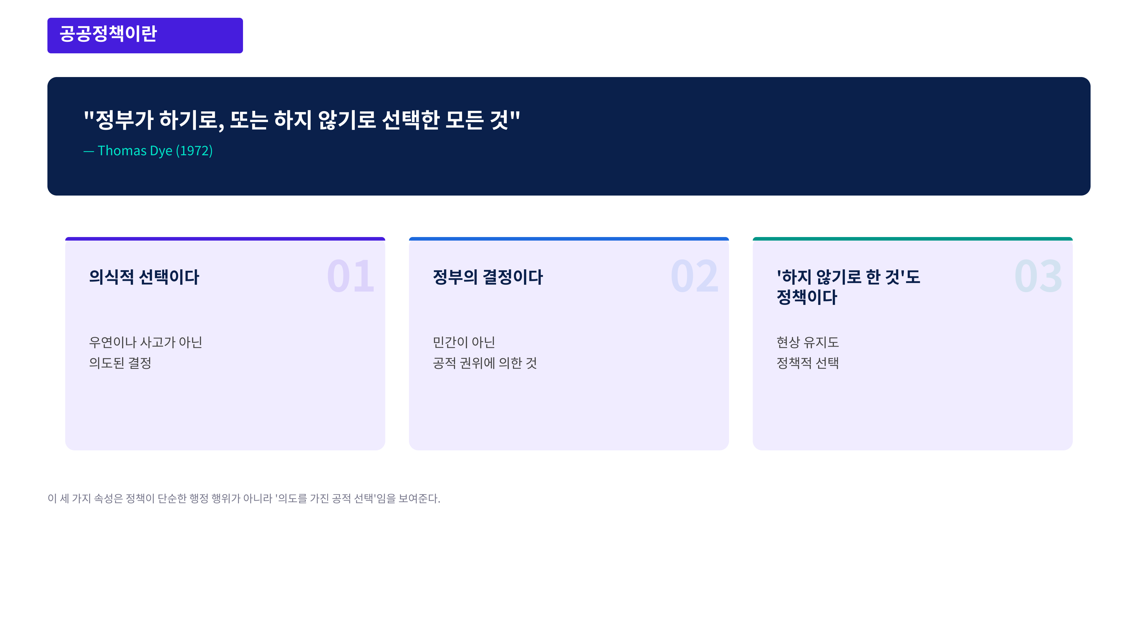 Thomas Dye(1972)는 공공정책을 "정부가 하기로, 또는 하지 않기로 선택한 모든 것"으로 정의했습니다. 여기서 중요한 세 가지 속성이 있습니다. 의식적 선택이라는 것, 정부의 결정이라는 것, 그리고 '하지 않기로 한 것'도 정책이라는 것입니다.