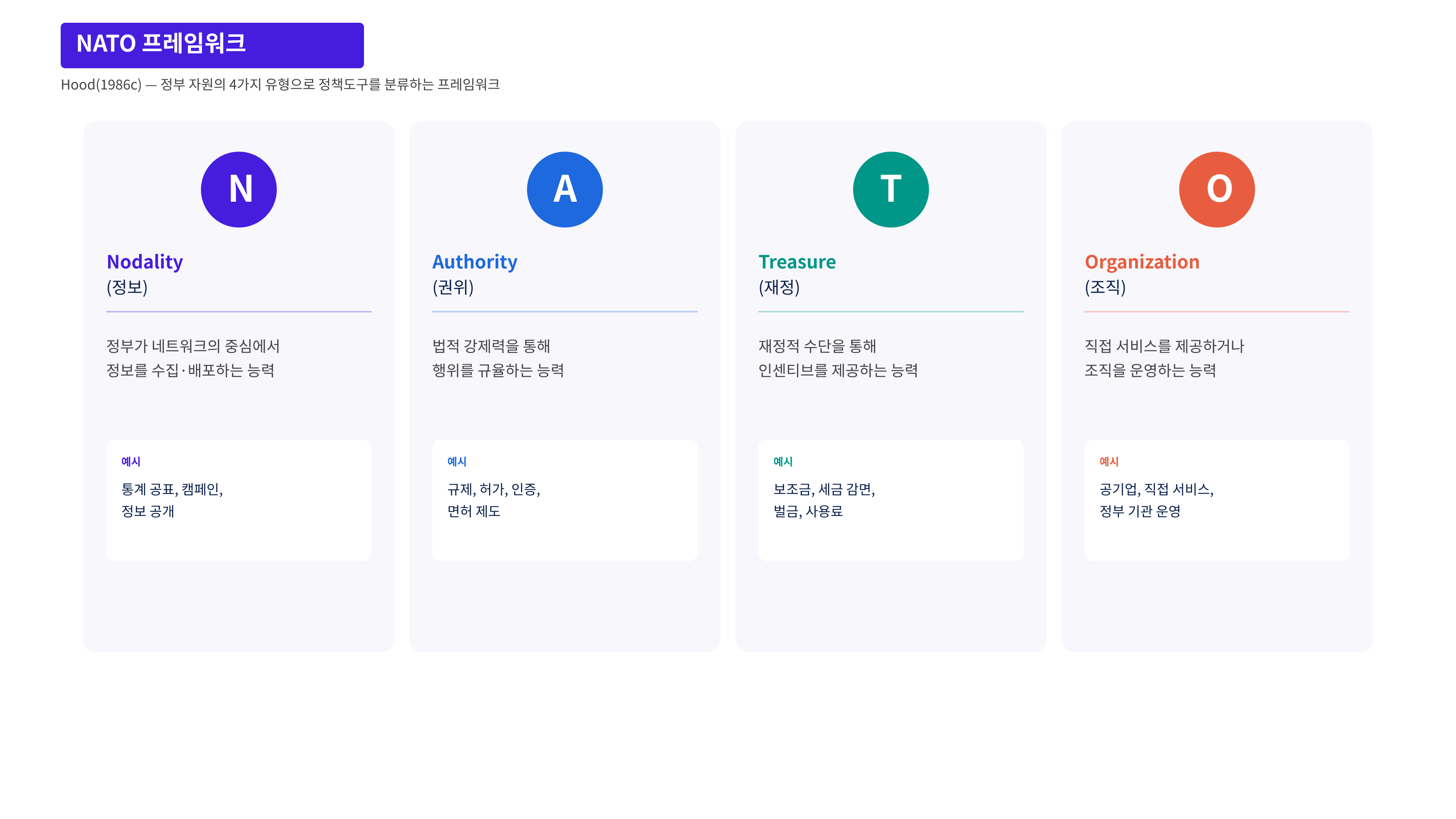 정책도구는 NATO 프레임워크로 분류할 수 있습니다. 정보(Nodality), 권위(Authority), 재정(Treasure), 조직(Organization) 네 가지 자원에 실질적/절차적 차원을 곱하면 8가지 도구 유형이 됩니다.