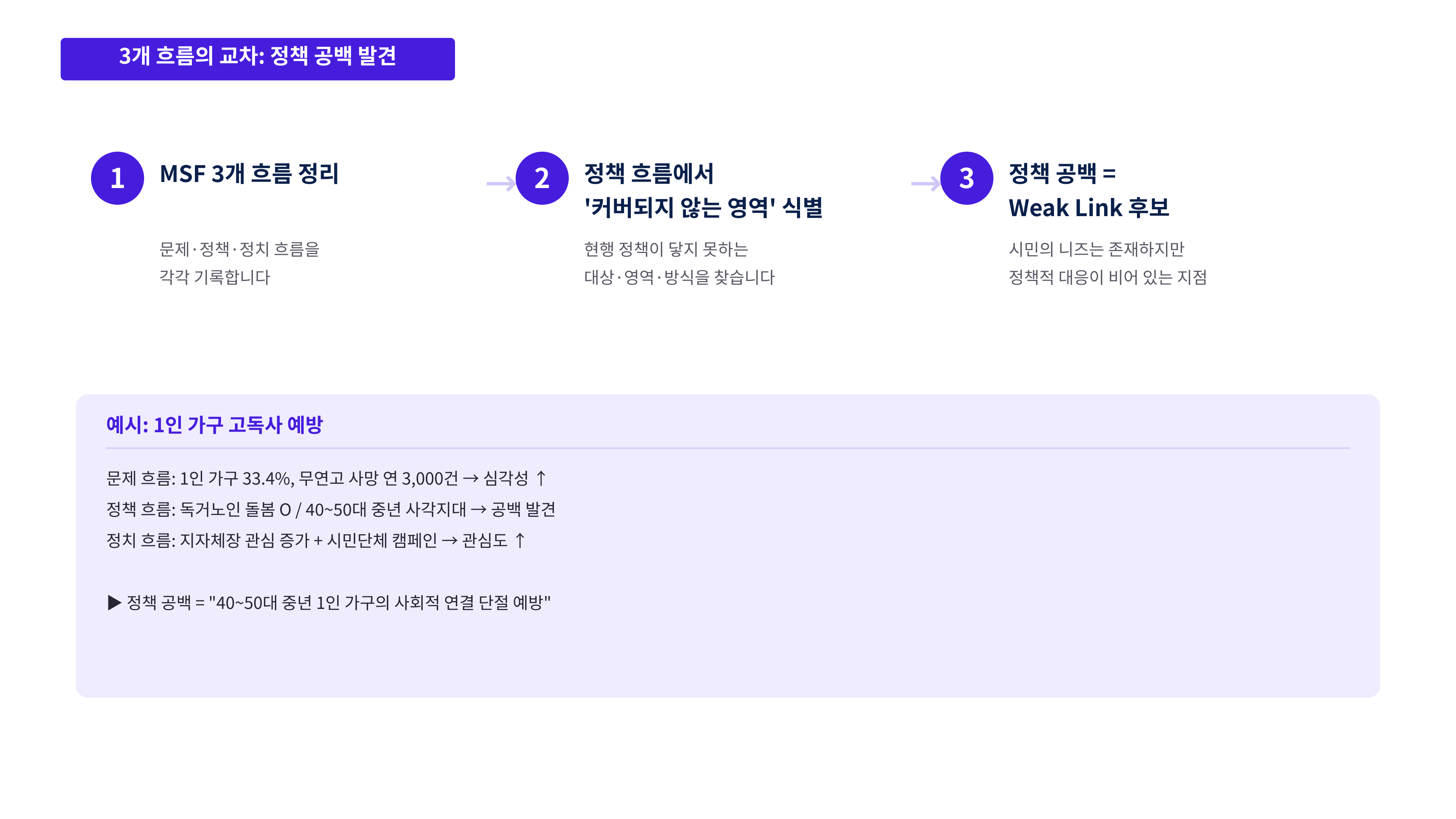 문제연구트랙이 선행연구의 빈틈을 찾는다면, 정책기획트랙은 정책의 공백을 찾습니다. MSF 3개 흐름을 정책 지형 정리 도구로 활용합니다.