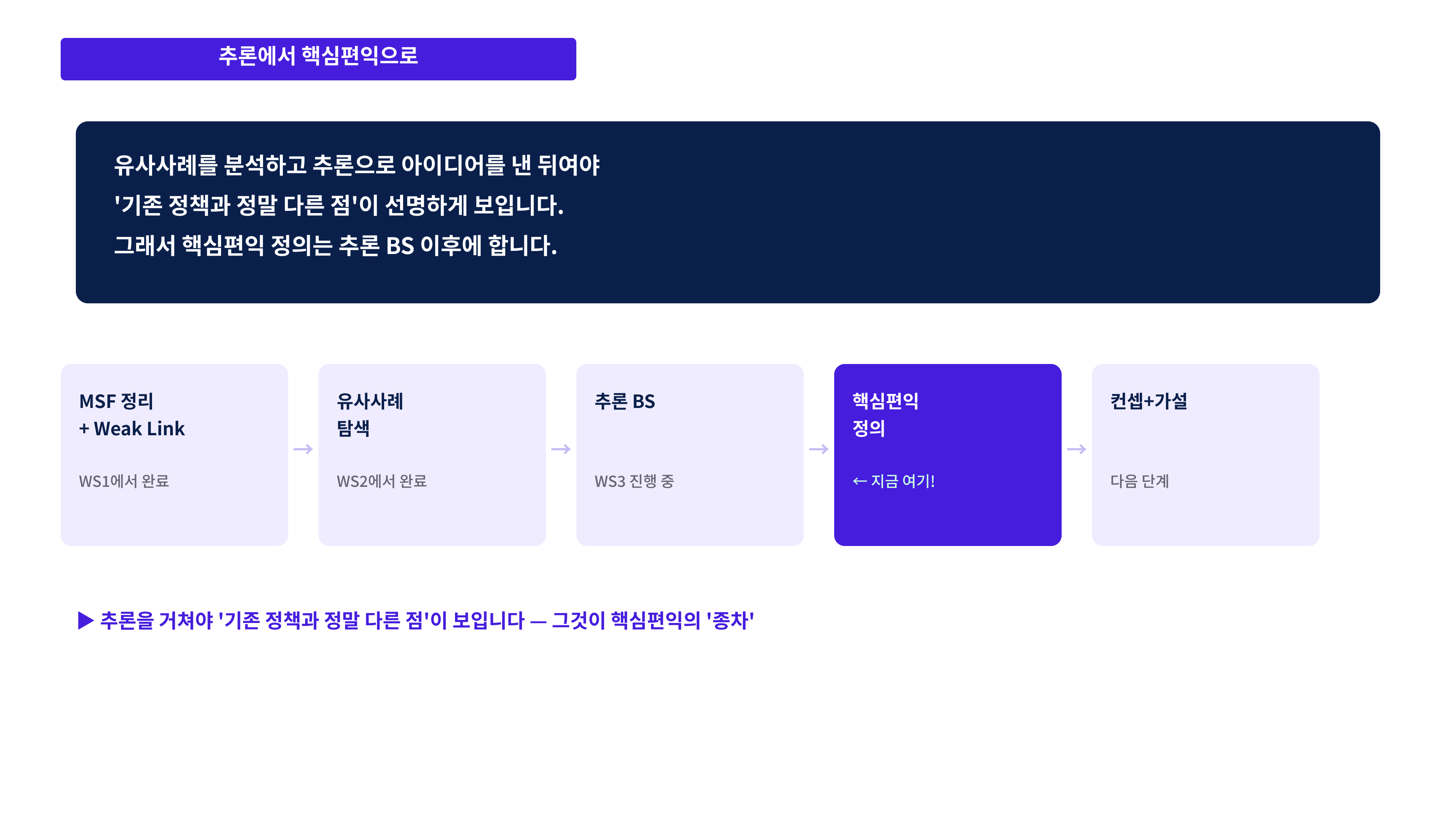 추론을 거쳐야 비로소 '기존 정책과 정말 다른 점'이 선명하게 보입니다. 핵심편익은 "[종차]한 [유]" 구조로 정의합니다. "생활 접점 기반(종차) 안부 확인 서비스(유)", "커뮤니티 주도(종차) 돌봄 정책(유)"처럼 추론 결과가 종차를 결정합니다.