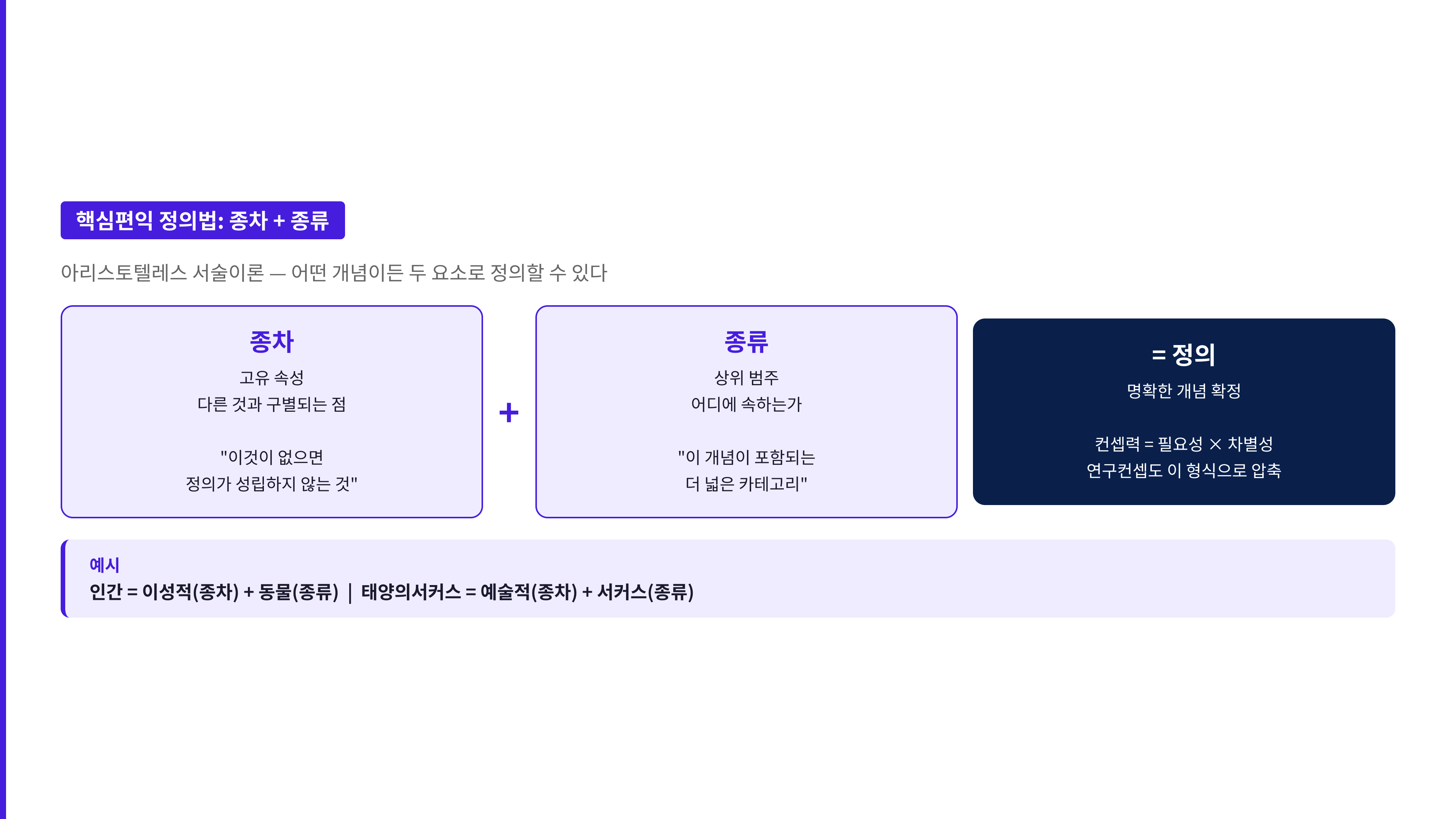 아리스토텔레스의 서술이론에서 빌려온 종차(고유 속성) + 종류(상위 범주) 구조는 연구컨셉을 압축하는 데 강력한 도구가 됩니다. "인간 = 이성적(종차) + 동물(종류)"처럼, 연구컨셉도 "어떤 차별적 관점(종차)으로 어떤 유형의 연구(종류)를 수행한다"로 정의할 수 있습니다.