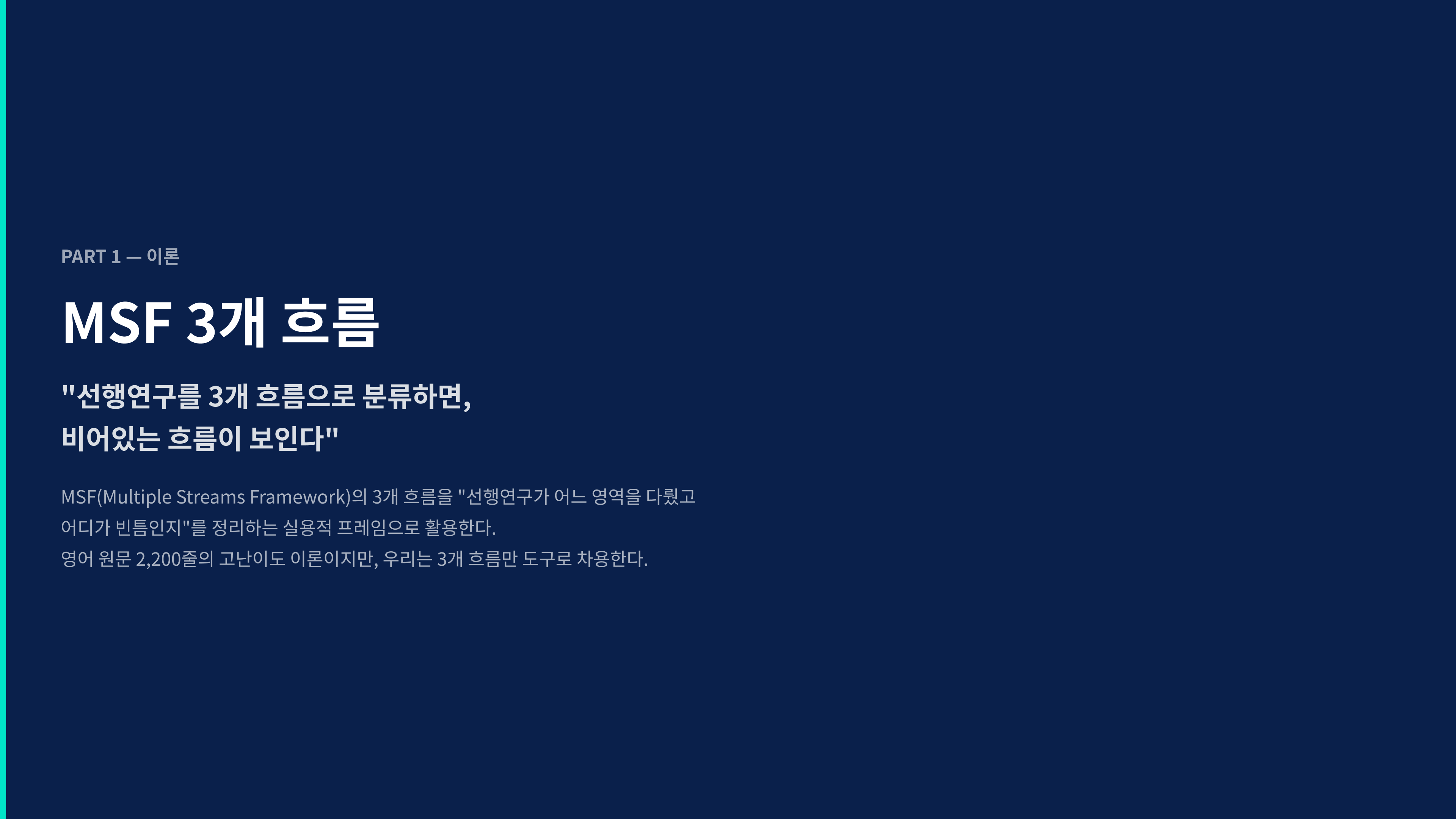 MSF 3흐름 분류는 단순한 정리 도구가 아닙니다. 기존 연구가 다룬 것과 다루지 않은 것을 체계적으로 보여주기 때문에, 연구자는 자신의 연구가 왜 필요한지를 증명할 수 있습니다. 그리고 유추/가추/변추 세 가지 렌즈는 Missing Link를 창의적 연구 아이디어로 전환하는 힘을 줍니다.