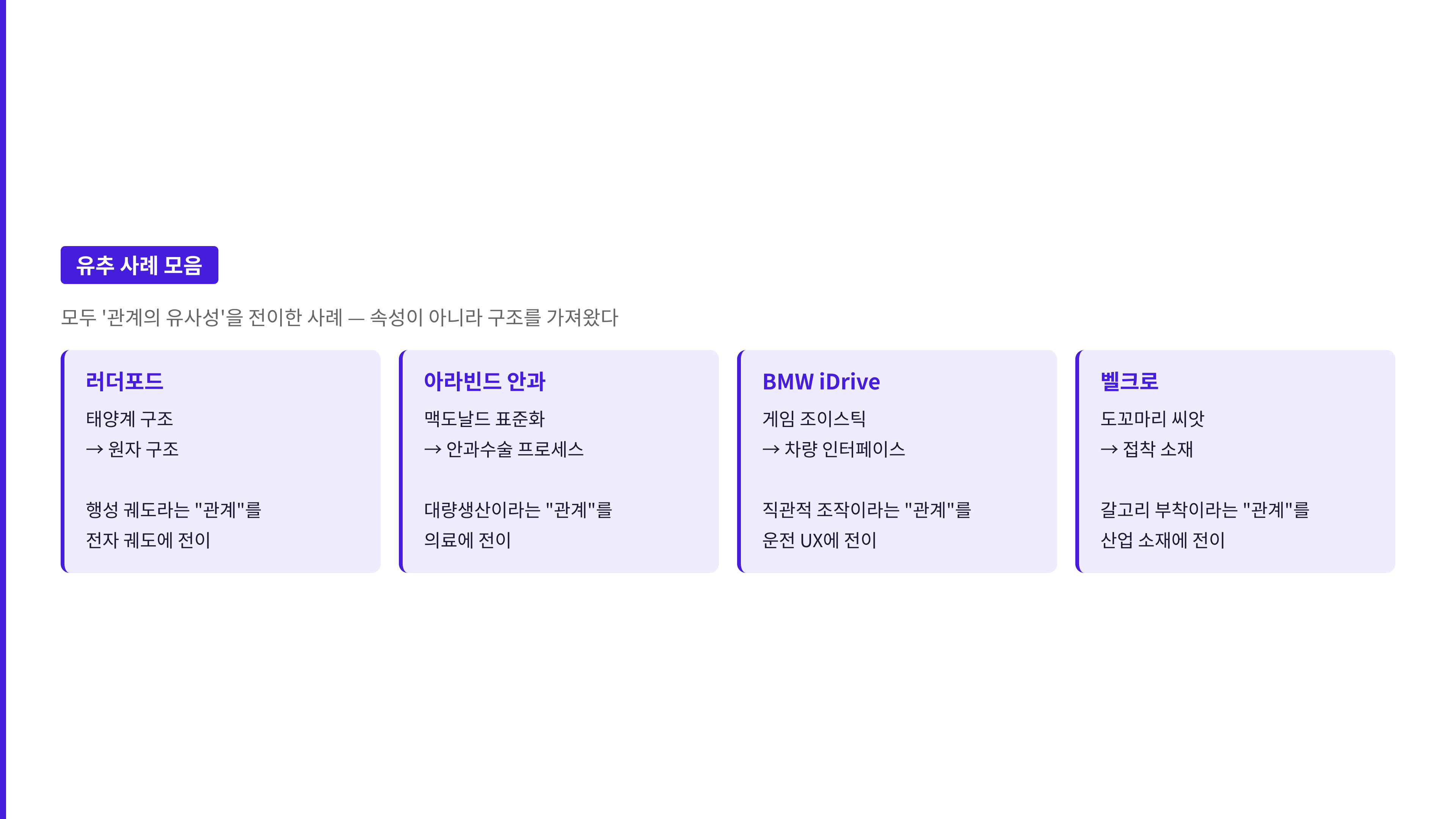 유추(Analogy) 는 다른 분야의 성공 구조를 전이하는 방법입니다. 맥도날드의 대량생산 프로세스를 안과 수술에 적용한 아라빈드 안과, 게임 조이스틱의 직관적 조작 구조를 차량 인터페이스에 전이한 BMW iDrive가 대표 사례입니다. 핵심은 속성이 아니라 '관계의 유사성'을 가져오는 것입니다.