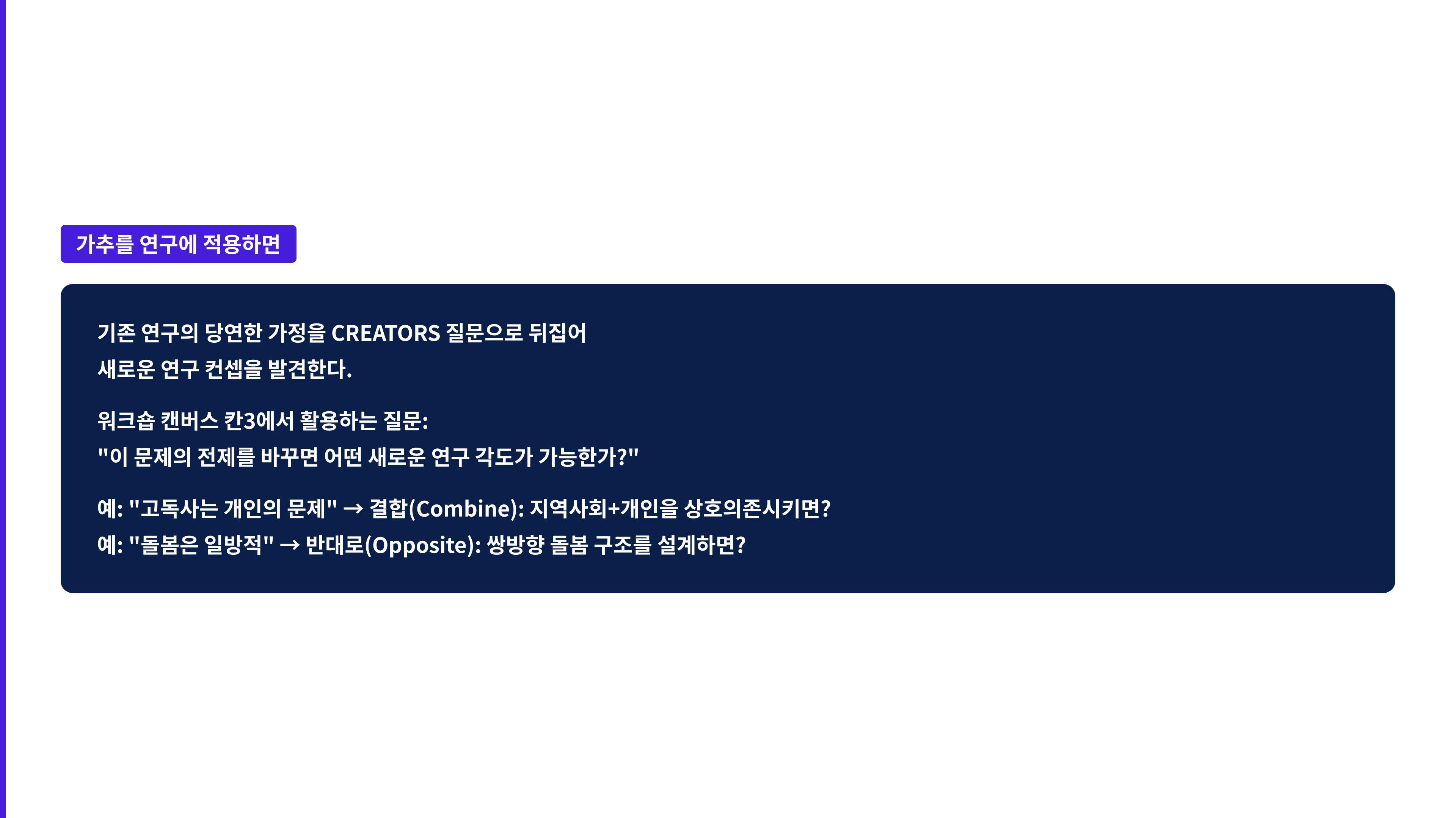 가추(Abduction) 는 당연한 가정을 뒤집는 방법입니다. CREATORS 10가지 질문 중 특히 "결합해서 상호의존시키면?"이 강력합니다. 전체 혁신의 35%가 이 질문에서 도출됩니다. 독립적이던 두 변수를 상호의존 관계로 재설정하면 새로운 연구 컨셉이 됩니다.