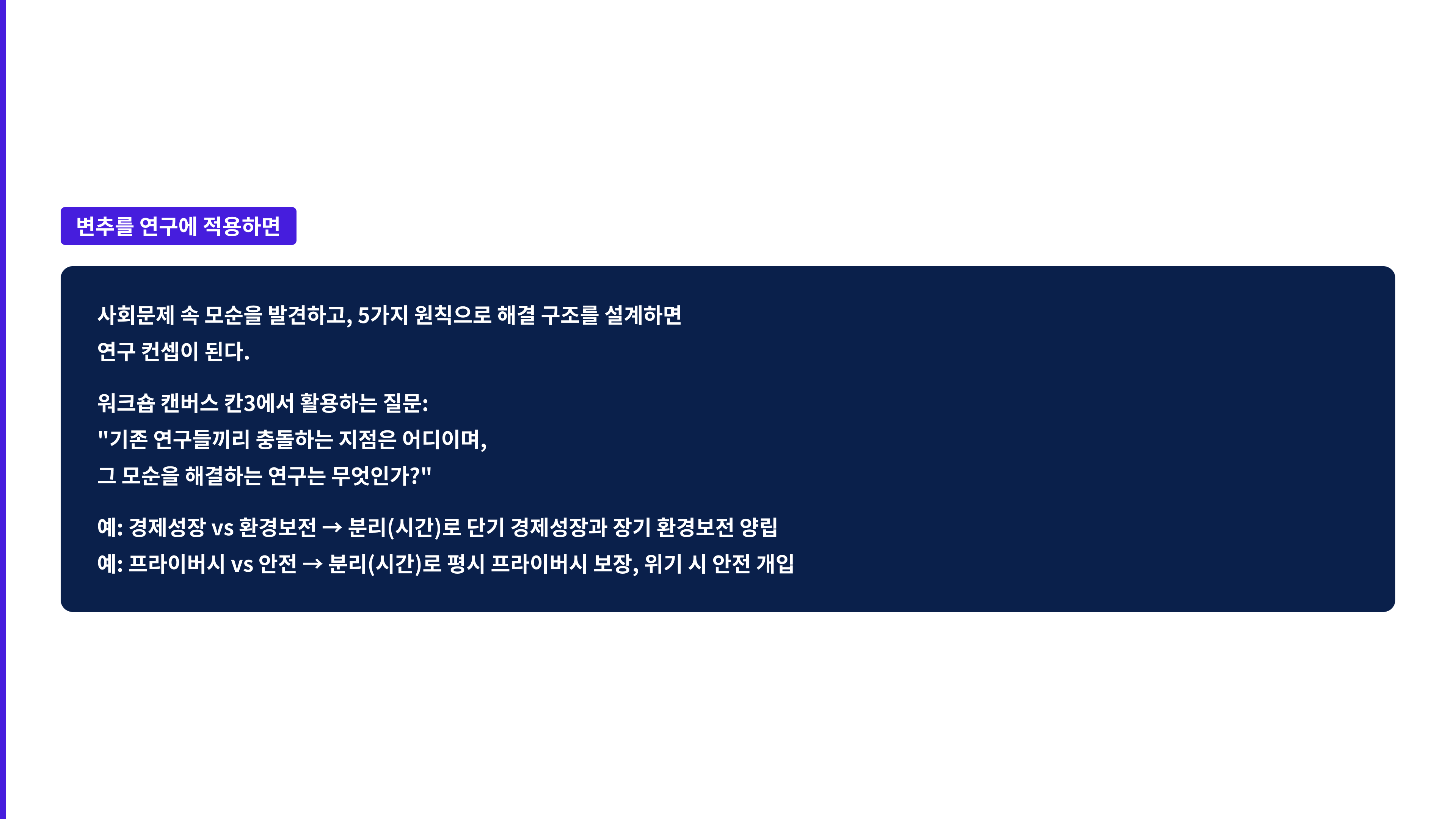 예를 들어 "청년 1인가구 고독사 예방 메커니즘 부재"라는 동일한 Missing Link에 세 가지 프레임워크를 적용하면 세 가지 다른 연구가 나옵니다.