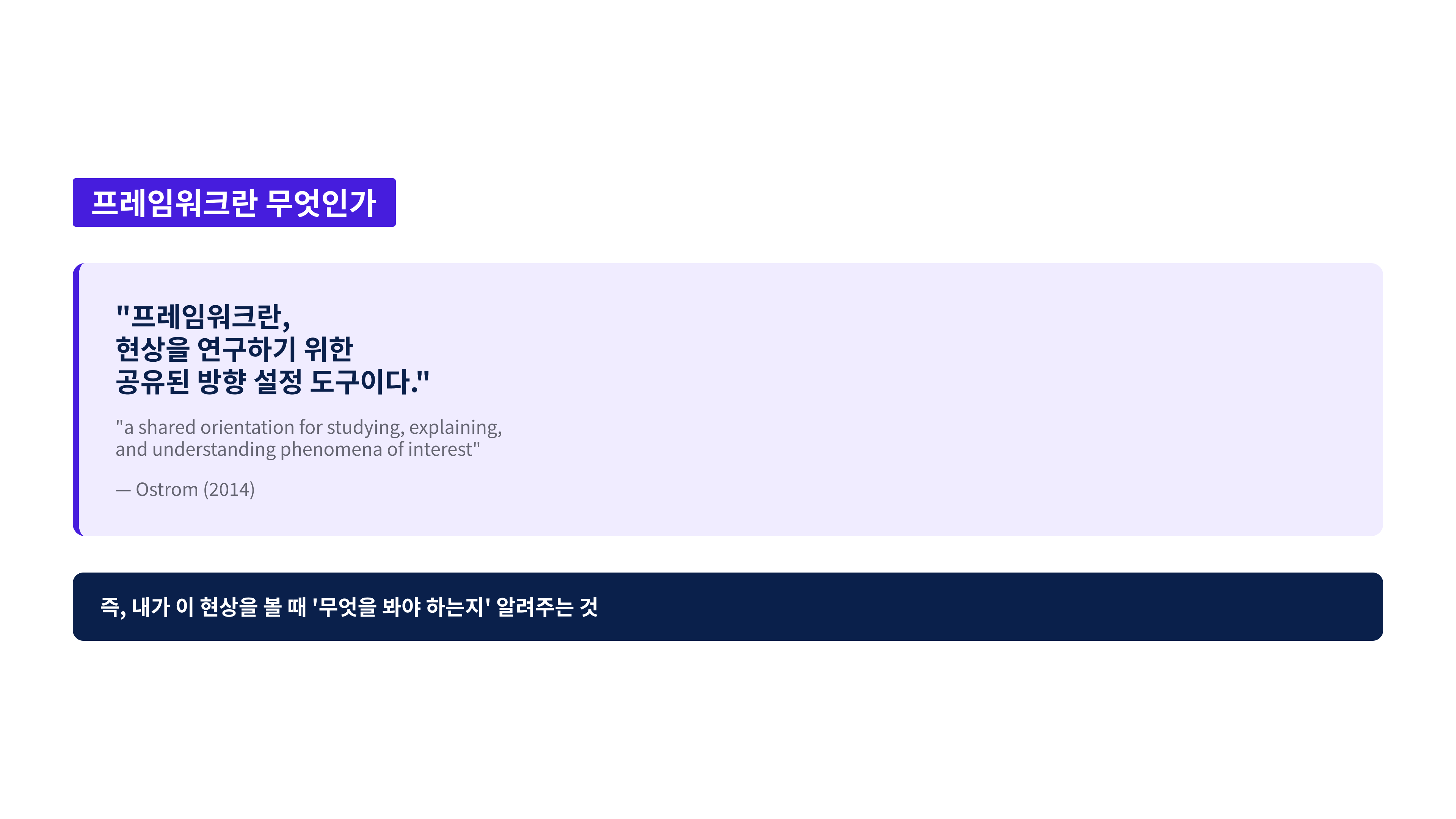같은 Missing Link도 어떤 프레임워크를 선택하느냐에 따라 완전히 다른 연구가 됩니다. 프레임워크란 "현상을 연구하기 위한 공유된 방향 설정 도구"(Ostrom, 2014)입니다. 지도가 무엇을 봐야 하는지 알려주듯, 프레임워크는 어디를 봐야 하는지를 알려줍니다.
