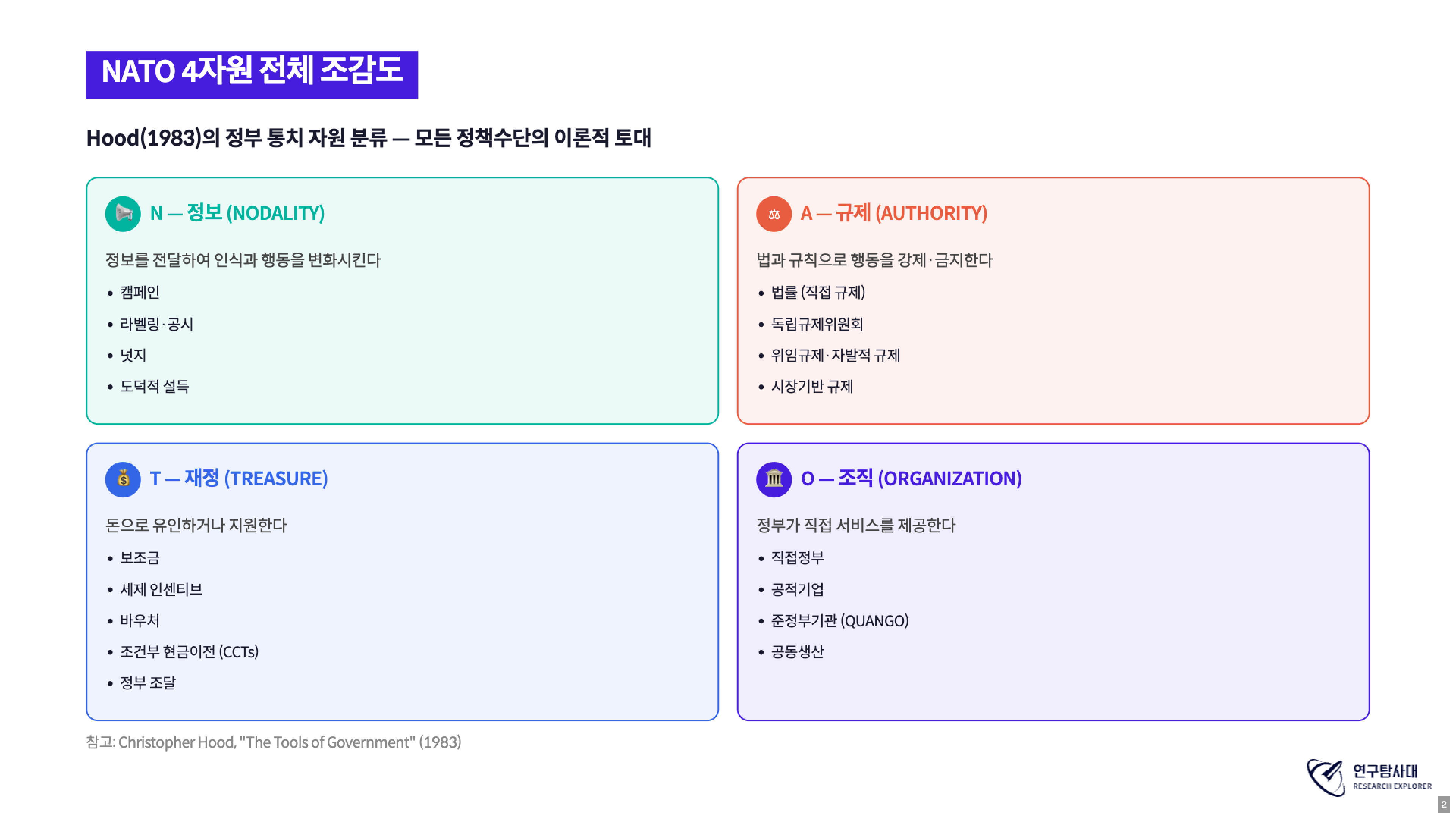 정책은 의지만으로 작동하지 않습니다. 결국 어떤 수단(instrument) 으로 시민의 행동과 자원을 움직일 것인지가 정책의 골격을 결정합니다. 영국 행정학자 Christopher Hood는 정부가 가진 자원을 네 가지로 분류합니다. 머리글자를 따 NATO 모형이라 부릅니다.