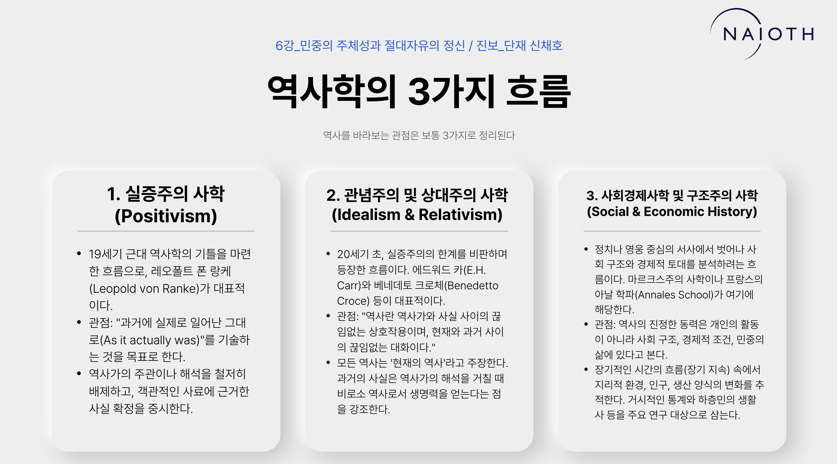 신채호에게는 이 세 가지가 모두 들어 있었다. 초기에는 영웅 서사와 실증적 사료 발굴에 집중했고, 중기에는 현재의 인식이 과거를 재구성한다는 상대주의적 통찰을 보여줬으며, 후기에는 민중의 구조적 힘에 주목하는 방향으로 전환했다.