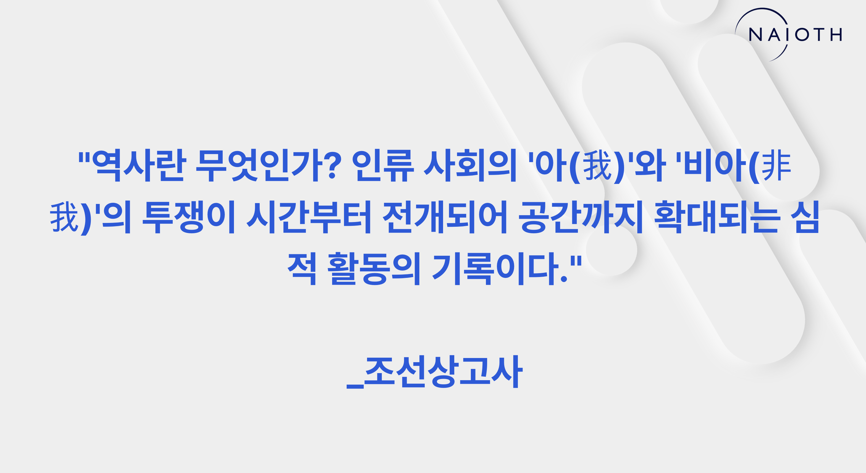 신채호 사상의 핵심 축은 '아(我)와 비아(非我)의 투쟁'이다. 『조선상고사』에서 그는 이렇게 선언했다. "역사란 무엇인가? 인류사회의 아와 비아의 투쟁이 시간부터 전개되어 공간까지 확대되는 심적 활동의 기록이다."