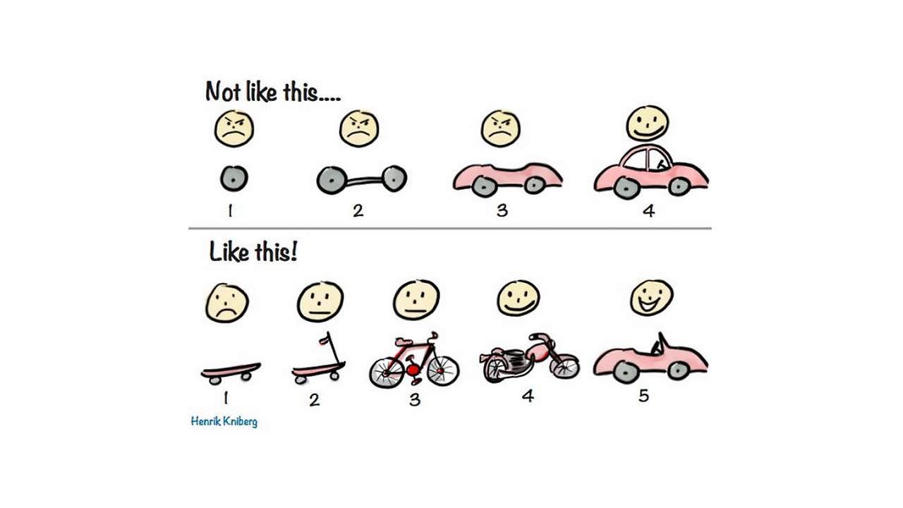 이러한 솔루션IP를 만들기 위해 대단한 학위나 엄청난 자본이 필요한 것은 아닙니다. 단 세 가지만 기억하시면 됩니다. 문제에 대해 깊이 '고민'하고, 대안을 '상상'하며, 실제 현장으로 나아가 '실행'하는 것입니다. 실리콘밸리의 '애자일(Agile)' 방법론을 떠올려 보시길 바랍니다. 처음부터 완벽한 자동차를 만들려고 하면 부품 수만 개와 엄청난 전문성이 필요해 압도당합니다. 하지만 일단 '스케이트보드'부터 만들어 보는 겁니다. 타보니 불편하면 손잡이를 달아 킥보드를 만들고, 페달을 달아 자전거를 만들고, 모터를 달아 오토바이를 거쳐 결국 자동차에 도달하게 됩니다.