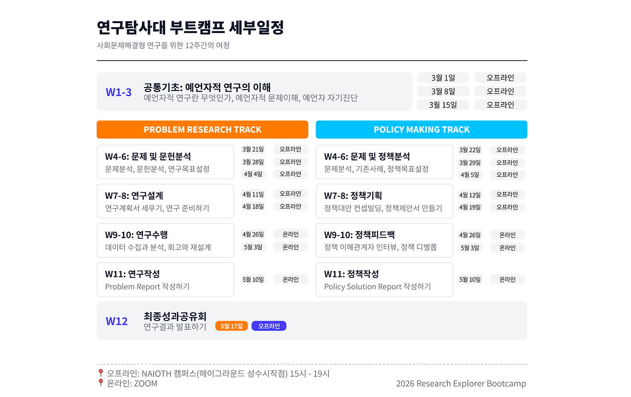 저희는 이러한 치열한 고민을 담아 10기 부트캠프를 '솔루션 IP 빌딩을 위한 12주 연구 훈련'으로 완전히 재설계했습니다. 다시 오프라인으로 돌아와 함께 모여 몰입하는 시간을 가질 예정입니다. 처음 3주간은 예언자적 연구자로 거듭나기 위한 마인드셋과 사회문제 매핑을 진행합니다. 이후 각자의 관심사에 따라 'Missing Link'를 찾는 문제 연구(현상 분석) 트랙과, 'Weak Link'를 공략하는 정책 기획(대안 설계) 트랙으로 나뉘어 훈련을 진행합니다.