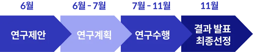 총 4개월 간의 연구수행과정을 통해 최종연구결과물을 작성하게 되고, 작성된 연구결과물을 토대로 심사를 통해 발표팀을 선정하게 됩니다.