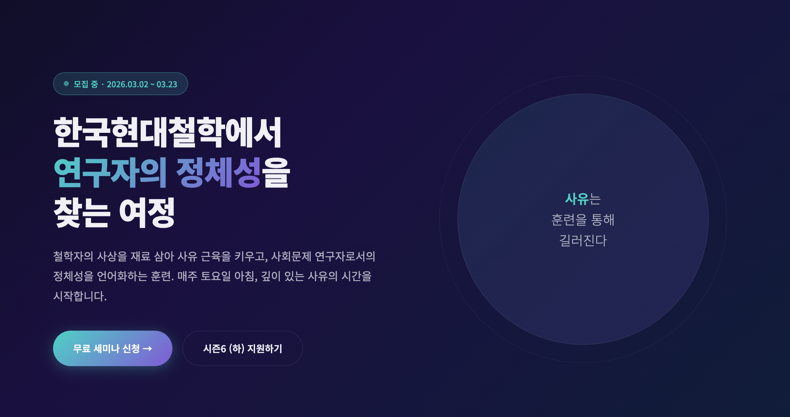 철학산책 시즌 6에서는 『처음 읽는 한국현대철학』 을 통해 한국의 철학자를 재료삼아 사유훈련을 진행합니다. 연구탐사대만의 독자적인 사유템플릿을 제공하며 이를 바탕으로 매주 핵심질문에 대한 답을 정리해갑니다.